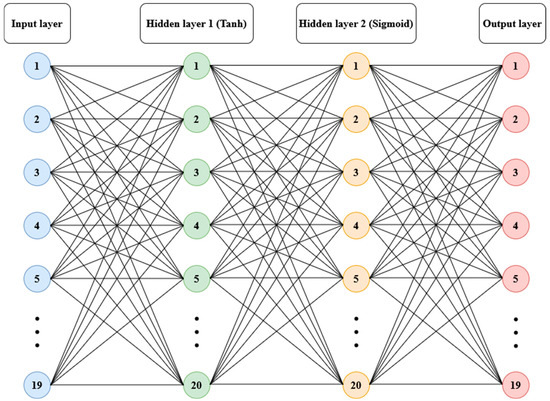 Structure of artificial neural network model: 19 variables in the input layer; hyperbolic tangent (Tanh) sigmoid corresponding to two hidden layers with 20 neurons each and the output layer.