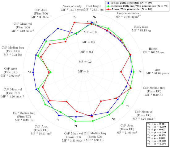 Radar chart comparing postural control and anthropometric characteristics among three groups: below the 25th percentile (green), between the 25th and 75th percentiles (blue), and above the 75th percentile (red). The layers of radar correspond to the multiplication factor (MF) of the variable’s value. The asterisks (*) indicate statistically significant differences between groups in the variance analysis, with the corresponding p-values provided in the legend. “MF” represents the mean ± standard deviation for each variable. CoP = center of pressure; EO = eyes open; EC = eyes closed.