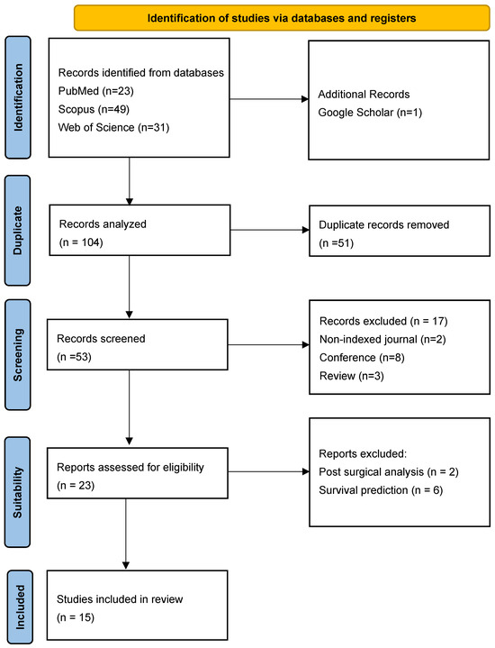 Inclusion criteria were defined to ensure that the systematic search remained strictly focused on the application of AI techniques for the diagnosis of GBM. The following inclusion criteria were applied in the review of the scientific literature: