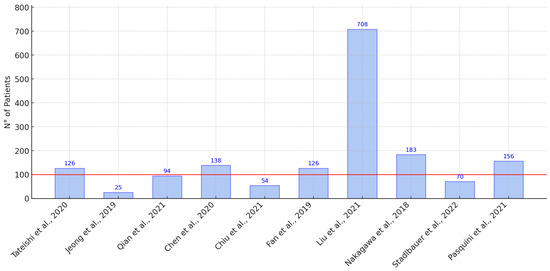 Distribution of sample sizes in the selected studies according to the references of the articles. The red line indicates the average sample size, with the outlier excluded (708 patients) [3,20,24,25,26,32,33,34,35,36].