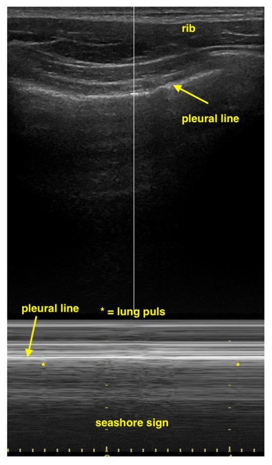 Linear transducers will deliver the best depiction of the pleural line, with convex ones delivering a wider but less detailed view [,]. To detect a pneumothorax, the patient must be in a supine or half-sitting position (30–45 degrees). The position of the probe is parasagittal on both sides of the sternum on two rib interspaces close to the highest point of the thorax and on the anterior axillary line. Confirming lung sliding (sliding lung sign) is the first scanning task. The confirmation of visceral and parietal pleural movement in opposite directions is achieved by saving a cine loop, an image using M-Mode (seashore sign). If sliding cannot be definitively confirmed, the next step is to look for vertical artifacts and the lung pulse. Such vertical artifacts typically originate from the pleural line and will usually not be seen in the presence of a pneumothorax at that location. Lung pulse excludes the presence of pneumothorax at that location, but may indicate a lack of ventilation of the affected side. It can be visualized with M-Mode or color Doppler at and slightly below the pleural line (color sign). Of note, lung sliding, typically occurring in the top 2 to 4 cm of the image, is usually not seen as clearly with a sector transducer when compared with linear or large convex probes [,,,] (Table 5, Figure 1, Figure 2 and Figure 3).
