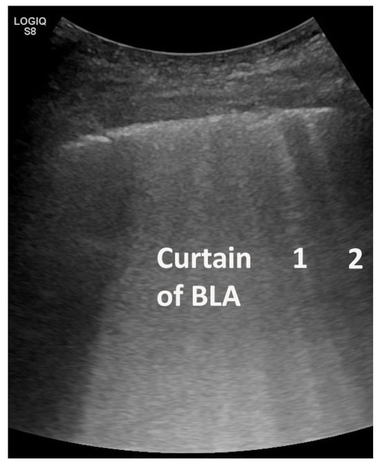 A cardiogenic pulmonary edema shows multiple B-line artifacts (BLAs) homogeneously distributed (as a “curtain” of BLA in the center of the image and lateral as individual BLA) bilaterally (evaluated by convex low frequency transducer <5 MHz without interfering presets). They arise from a smooth pleural line, are well defined, hyperechoic, extending indefinitely (at least 10 cm), and moving with lung sliding.