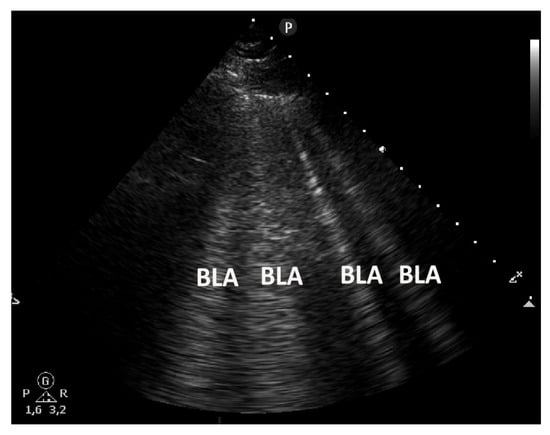 A cardiogenic pulmonary edema with multiple B lines (BLA) evaluated by sector transducer.