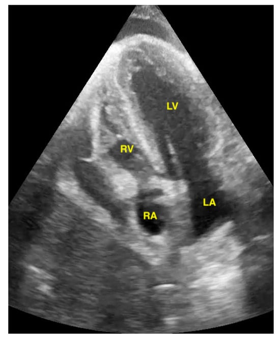 Pericardial effusion in apical four chamber view compresses the right atrium slightly (RA = right atrium, LA = left atrium, RV = right ventricle, LV = left ventricle).