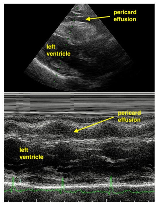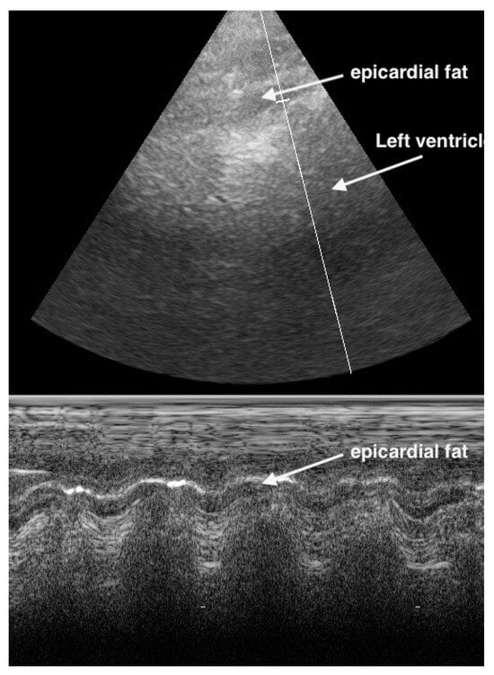 M-Mode can help to differentiate between pericardial effusion and fat. Pericardial effusion undergoes a fluctuation during heart movement and so shows a hypoechoic band which moves in thickness. In contrast, the hypoechoic band of fat does not change in thickness (Figure 11 and Figure 12).
