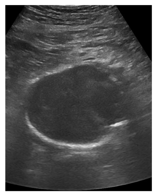 An examination of the abdominal aorta can be performed with either a convex or sector probe []. The aorta is assessed for dilation with the ultrasound transducer in a transverse orientation. Traditionally, the diameter is measured in the anterior–posterior orientation, but saccular aneurysms should not be overlooked. A diameter of over 3 cm is considered to be an aortic aneurysm. A diameter of over 5 cm increases the risk for rupture (Figure 18). The most important risk factor for rupture is the diameter []. There is no measurement that proves a rupture, but for women with a diameter of more than 5 cm and for men with a diameter of more than 5,5 cm, the rupture risk increases, and, therefore, certain guidelines see this as an indication for surgery even if patients are asymptomatic. Any symptomatic aneurysm should be operated on []. Thus, in the event of shock and the presence of an aortic aneurysm without any other cause for shock, a ruptured aortic aneurysm must be considered. Hemorrhage is often retroperitoneal, rather than intraperitoneal, where it is difficult to identify. Possible additional signs in abdominal aortic aneurysm are summarized in the following sequence.