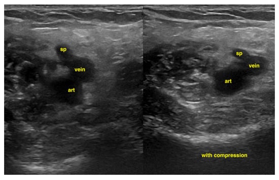 - Zuker-Herman, R.; Ayalon Dangur, I.; Berant, R.; Sitt, E.C.; Baskin, L.; Shaya, Y.; Shiber, S. Comparison between two-point and three-point compression ultrasound for the diagnosis of deep vein thrombosis. J. Thromb. Thrombolysis 2018, 45, 99–105. [Google Scholar] [CrossRef]