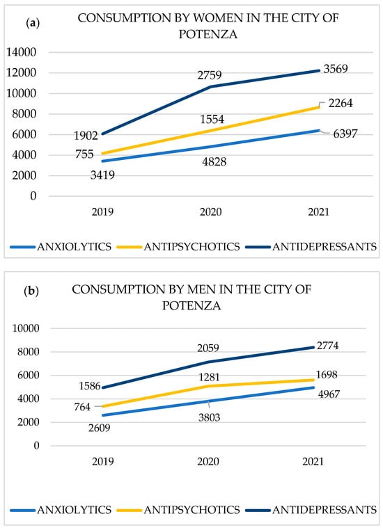 (a,b) Evolution of pharmacological consumption (number of boxes) by gender for the period 2019–2021 in the city of Potenza.