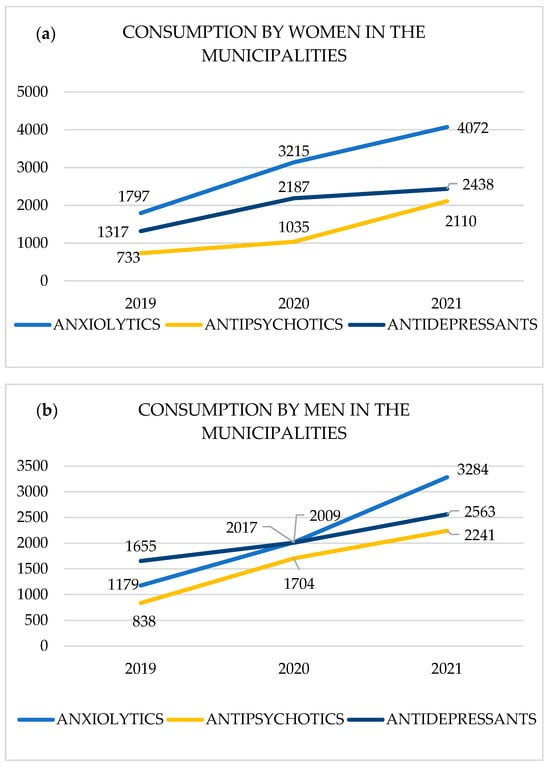 In the municipalities of Potenza province, the psychotropic most consumed by women were anxiolytics with the number of prescriptions increased from 1797 in 2019 to 4072 in 2021 with a total of 9084 boxes sold in 2019–2021, in second place were antidepressants from 1317 in 2019 to 2438 in 2021 with a total of 5942 boxes sold in 2019–2021, and in third place were antipsychotics from 733 in 2019 to 2110 in 2021 with a total of 3878 boxes sold in 2019–2021 (Figure 2a).