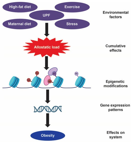 The effects of environmental factors on the epigenome. External variables such as ultra-processed foods (UPFs), stress, maternal diet, exercise habits, and high-fat diet increase allostatic load to the system, causing changes to the epigenome. This, in turn, changes gene expression patterns which lead to maladaptive states such as obesity.