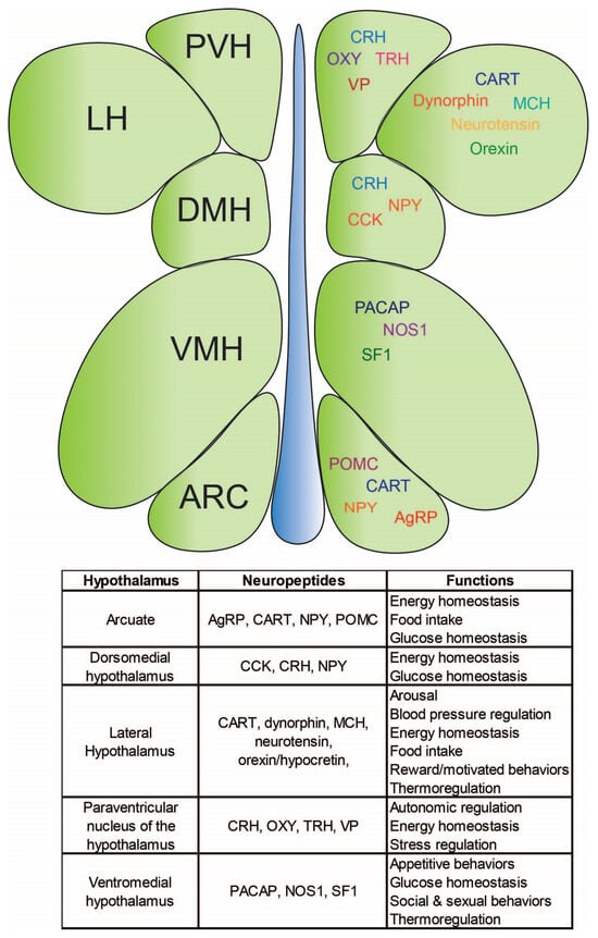 In order to understand how metabolism is influenced by allostatic loads it is important to discuss neurobiological mechanisms that govern body energy homeostasis, the most important of which is the master gland, the hypothalamus. The hypothalamus is a small but critical structure in the brain. Given that it occupies only 1% of our total brain weight (4 g out of the 1.2 to 1.4 kg total brain weight), this caudal structure carries great importance in the context of our physiology []. Its functions are wide-ranging and include body fluid and energy homeostasis, reproductive behaviors, thermoregulation, the regulation of circadian rhythms, sleep, and emotional expression [].
