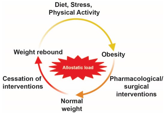 External variables (i.e., high-caloric diets, decreased physical activity, stress) increase propensity to develop obesity. Obesity can be temporarily reversed by pharmacological/surgical interventions but can be reversed over time after cessation of treatment, presumably through the result of increased allostatic load.