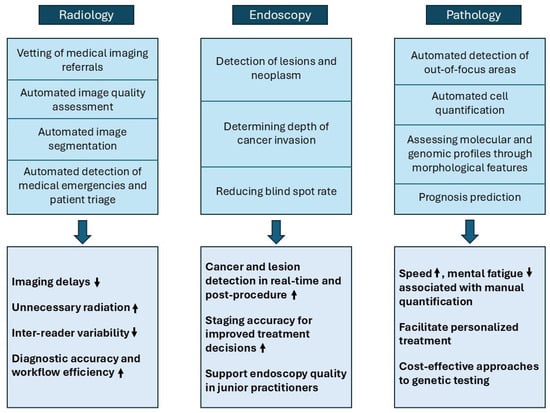 AI is profoundly transforming the field of medical diagnostics by enhancing accuracy and efficiency across various specialties. In radiology, AI algorithms are revolutionizing image analysis by enabling precise lesion detection and segmentation, while also automating quality assurance processes to ensure optimal imaging standards. In endoscopy, AI aids in identifying abnormalities with greater sensitivity, improving diagnostic outcomes during procedures. Similarly, pathology has seen significant advancements through AI-driven tools that classify tissues, predict prognosis, and link morphological features to genomic data. These innovations, as illustrated in Figure 1, underscore AI’s potential to streamline workflows and reduce diagnostic variability, ultimately elevating patient care standards.