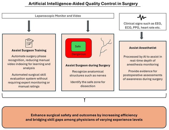 AI is used in surgery to assist both surgeons and anesthetists, as illustrated in Figure 2. For surgeons, AI supports key areas such as training and surgical procedures, while for anesthetists, it aids in monitoring and decision-making during anesthesia management.