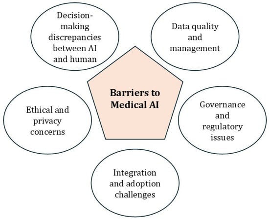 The integration of AI into clinical practice presents several challenges that must be addressed to ensure its effective and responsible use in healthcare, as shown in Figure 3. Human decision-making in medicine is context-driven and efficient, allowing for simplification based on relevant cues. In contrast, AI systems process all available information without the ability to ignore extraneous data or question dataset validity. This fundamental difference creates a significant challenge for integrating AI into clinical practice, as AI may use statistically relevant but clinically meaningless features, leading to decisions misaligned with clinicians’ cognitive approaches. This difference presents a major challenge for integrating AI into clinical practice, as AI’s opaque “black box” decision-making hinders trust and complicates clinicians’ ability to predict or understand AI errors and biases [128]. To overcome these challenges, strategies such as developing user-friendly AI interfaces, enhancing clinician trust through Explainable AI (XAI), integrating AI training into medical curricula, and creating protective policies for healthcare professionals are essential [129].