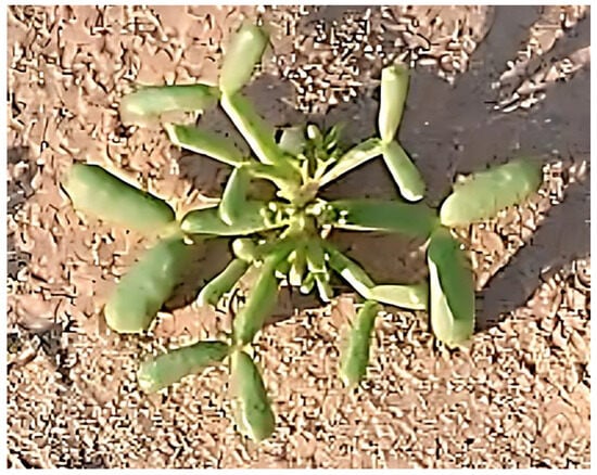 Zygophyllum coccineum L., commonly known as Tebtab, is a subshrub, belonging to the Zygophyllaceae family, with remarkable ecological adaptability (Figure 1). It thrives in diverse soil compositions and saline habitats, displaying a strong tolerance for heavy-metal stress. This plant has a wide range of traditional medicinal applications, including treatments for skin, stomach, and liver ailments, as well as conditions like rheumatism, gout, hypertension, and flatulent colic. It is also recognized for its anthelmintic, anti-inflammatory, and antidiabetic effects, which are attributed to its rich composition of flavonoids and phenolic acids [6,7,8]. Additionally, Z. coccineum plays an essential role in traditional veterinary medicine, where it is used for livestock and camels and as a therapeutic agent for conditions like arthritis [6,9].