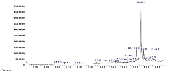 Component identification was conducted using Gas Chromatography–Mass Spectrometry (GC-MS) with an Agilent Technologies DB-5 MS capillary column (30 m × 0.25 mm internal diameter × 0.25 µm phase thickness). Helium served as the carrier gas, at a flow rate of 1 mL/min. The inlet temperature was set to 250 °C in split mode (50:1). The oven temperature was programmed to increase from 50 to 250 °C over 50 min. Mass spectrometry settings included a mass range of 40–500 g/mol, a scan speed of 1.56, a solvent delay of 9 min, and a source temperature of 230 °C, as per the methodology in [15].