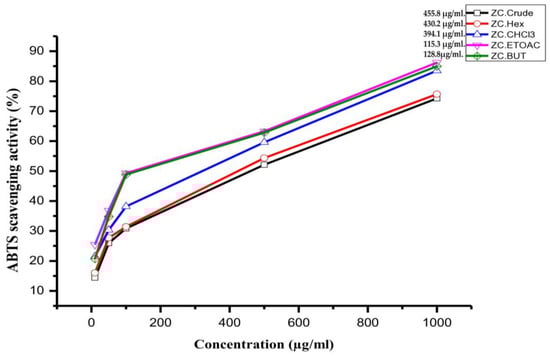 The antioxidant capacity of the Z. coccineum extracts and their fractions was evaluated using an ABTS radical cation scavenging assay based, with some modifications, on the protocol described in [16]. ABTS radical cations were generated by reacting the ABTS solution with a suitable oxidizing agent. The extracts were then mixed with the prepared ABTS radical solution, and the decrease in absorbance was measured at a specific wavelength using a spectrophotometer. The antioxidant activity was expressed as IC50, indicating the concentration of the extract required to scavenge 50% of the ABTS radicals.