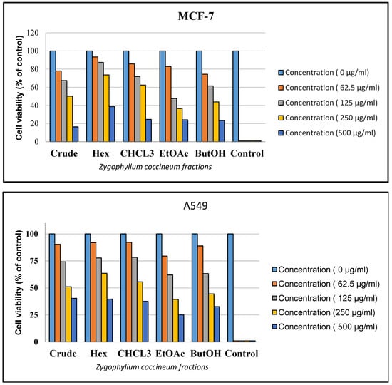 The cytotoxicity and cell viability effects of Z. coccineum extracts were assessed using the MTT assay, which was based on the protocol outlined in [16]. In this assay, cells (A549 (lung cancer) and MCF-7 (breast cancer)) were seeded into 96-well plates and treated with different concentrations of the extracts. After the incubation period, MTT reagent (a yellow tetrazole) was added to each well. Viable cells metabolized the MTT into insoluble formazan crystals, which were dissolved using a solubilization solution. The absorbance of the resultant solution was measured at 570 nm using a microplate reader. The cell viability was expressed as a percentage relative to untreated control cells.