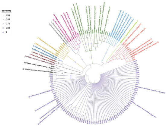 HBV sequences were aligned using the CLUSTAL W program in MEGA version 10 software with default settings. A phylogenetic tree was constructed using the Maximum Likelihood method of the MEGA10 software with the Kimura-2 parameter model with 1000 bootstrap replicates to assess the reliability of the output tree [12,13]. Reference sequences of HBV genotypes A-J and relative subtypes were downloaded from the HBV database (https://hbvdb.lyon.inserm.fr/HBVdb/HBVdbIndex, accessed on 1 August 2009). The Newick version of the phylogenetic tree constructed in MEGA 10 was imported into the Interactive Tree of Life (iTOL) for annotation and presentation [14]. The HBV sequences generated in this study (101/102 because of the unavailability of one sequence) were deposited into the NCBI GenBank under accession number PQ349088 to PQ349188.