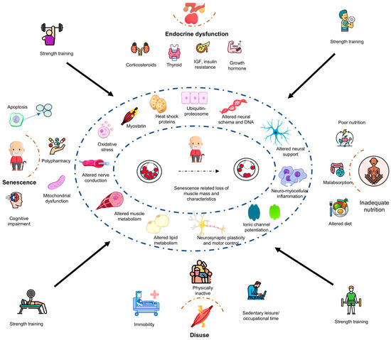 - Larsson, L.; Degens, H.; Li, M.; Salviati, L.; Lee, Y.I.; Thompson, W.; Kirkland, J.L.; Sandri, M. Sarcopenia: Aging-Related Loss of Muscle Mass and Function. Physiol. Rev. 2019, 99, 427–511. [Google Scholar] [CrossRef]