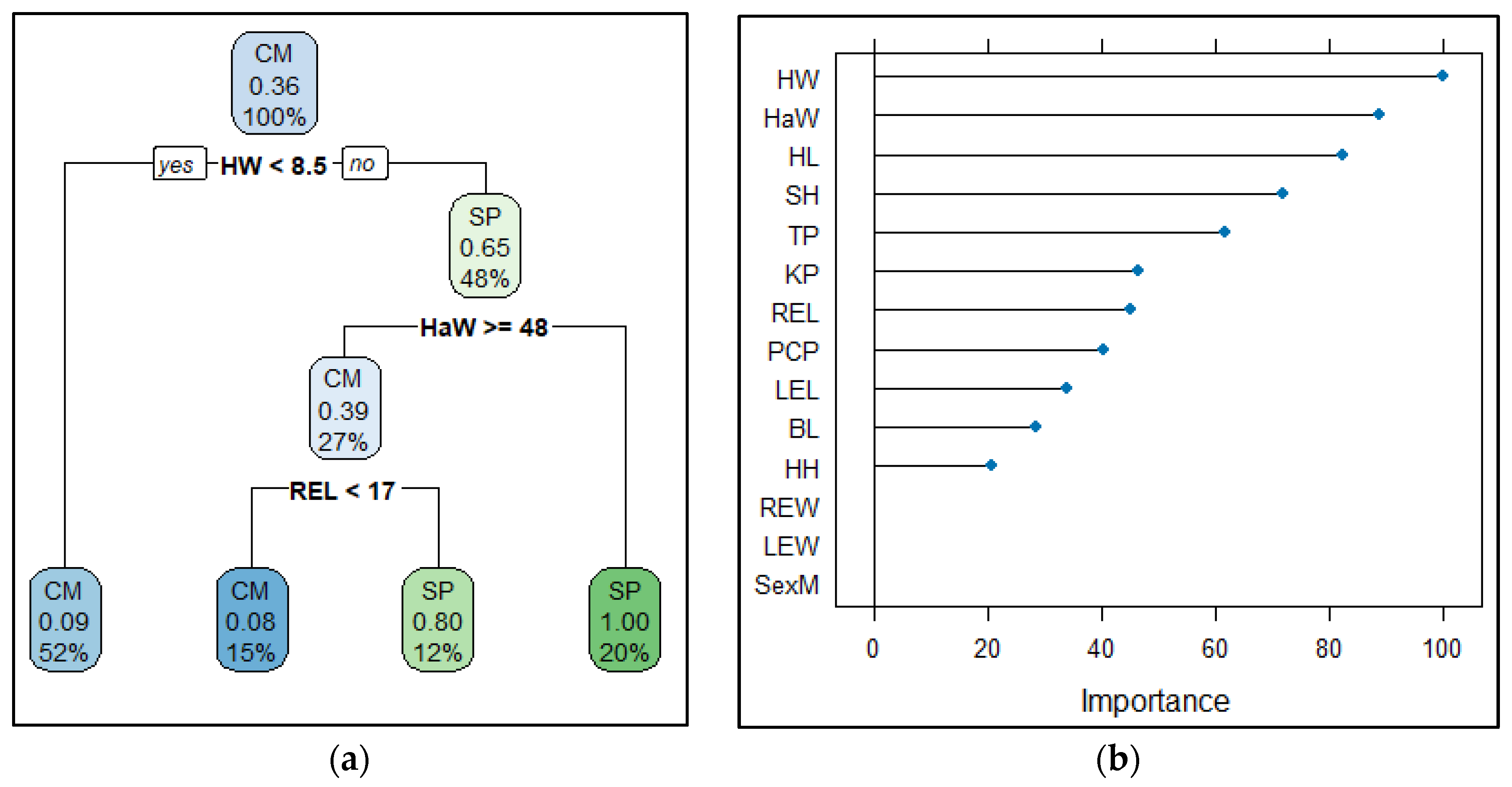 (a) Final classification tree. Information within nodes from top to bottom corresponds to predictions, predicted probability of SP breed, and percentage of observation in the node, respectively. (b) Variable importance graph. CM: “Casco de Mula”; SP: San Pedreño; TP: thoracic perimeter; BL: body length; HaW: height at withers; SH: sternum height; KP: knee perimeter; HL: head length; HW: head width; LEL: left ear length; LEW: left ear width; REL: right ear length; REW: right ear width; PCP: posterior cannon perimeter; HH: hock height.