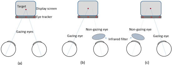 Schematic presentation of viewing conditions. (a) Binocular viewing; (b) monocular non-fixation for the right eye and monocular viewing for the left eye; (c) monocular viewing for the right eye and monocular non-fixation for the left eye.