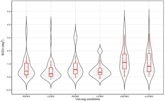 When fixation stability was visualized using box-and-whisker and violin plots, as shown in Figure 2, fixation stability was the highest under binocular viewing conditions (RE/BV and LE/BV), with smaller BCEA values and narrower data distributions. Under monocular viewing conditions (RE/MV and LE/MV), BCEA values increased, indicating slightly reduced fixation stability. For the covered eye conditions (cRE/MV and cLE/MV), the BCEA values increased significantly, showing the lowest fixation stability.
