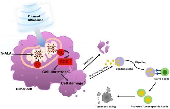 In different in vitro and in vivo studies SDT has proven to be effective although the deep understanding of the mechanism behind 5-ALA-SDT is discussed differently. One of them is based on the so-called sonoluminescence, which involves the conversion of ultrasound into light, resulting in the photoactivation of PpIX through the so-called PDT mechanism which was first demonstrated by Umemura and confirmed by Rosenthal [26,27]. The researchers were able to demonstrate that under acoustic conditions, a sonoluminescence spectrum was generated in the wavelength range from 300 to >500 nm. Sonoluminescence can activate almost the entire absorption spectrum of PpIX. Today, the consensus is that the ultrasound waves during SDT create a cavitation environment in which microbubbles form and that the bursting of the cavitation bubbles releases energy in the form of blue light, which activates tumor cells enriched with PpIX [28]. As a sonosensitizer, the activated PpIX releases singlet oxygen (1O2) which affects radical oxygen species (ROS) mitochondrial function leading to cell stress which induces the oxidation of pro-apoptotic protein Bcl2 and induces caspase activation [7,29] resulting in the apoptosis of cancer cells confirmed from a morphological and molecular biological perspective [30,31] which can lead to antitumor immunity as shown in Figure 1.