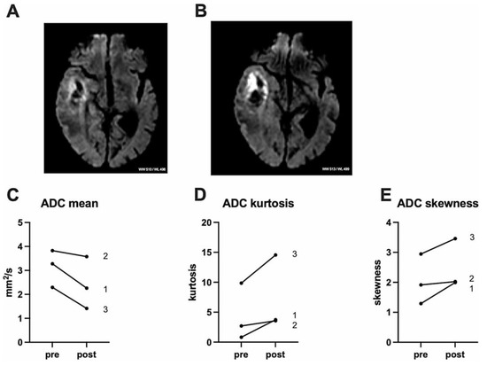 The figure represents the illustrative example of diffusion imaging of patient 1 before (A) and after (B) sonication (TR: 2658.3 ms; TE: 80.8 ms, ST: 6 mm/SP: 7 M). Change in diffusion imaging values ADC mean, ADC kurtosis, and ADC skewness in all patients, labeling refers to patient number ((C–E), respectively). Paired t-testing resulted in p 0.09 (C), p 0.12 (D), and p 0.13 (E). ADC, apparent diffusion coefficient [51]. Copyright by CC BY 4.0 https://creativecommons.org/licenses/by-nc/4.0/deed.en (accessed on 19 March 2025).