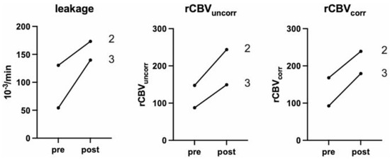 The figure represents the change in tumor perfusion. Labeling refers to patient number. Paired t-testing resulted in p 0.12 (leakage), p 0.14 (rCBVuncorr), and p 0.06 (rCBVcorr). rCBVuncorr, uncorrected relative cerebral blood volume; rCBVcorr, corrected relative cerebral blood volume [51]. Copyright by CC BY 4.0 https://creativecommons.org/licenses/by/4.0/deed.en (accessed on 19 March 2025).