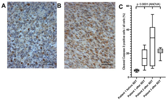 The figure represents anti cleaved caspase 3 immunohistochemistry in patient 1 before (A) and after (B) SDT. Comprehensive tissue analysis of all patients (C) [51]. Copyright by CC BY 4.0 https://creativecommons.org/licenses/by/4.0/deed.en (accessed on 19 March 2025).