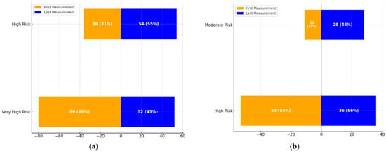 Figure 1. (a): Transition dynamics between High-Risk and Very High-Risk categories over the treatment period. The figure shows the proportion of patients in each category at the first and last measurements. (b): Transition dynamics between Moderate-Risk and High-Risk categories over the treatment period. The figure highlights the changes in the number and percentage of patients transitioning between these categories at the first and last measurements.