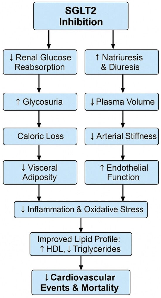 Figure 2. Proposed cardiometabolic mechanisms of SGLT2 inhibition. This schematic flowchart illustrates how SGLT2 inhibitors trigger renal glucose and sodium excretion, leading to downstream effects on visceral adiposity, insulin sensitivity, endothelial function, inflammation, lipid profile, and ultimately reduce cardiovascular events and mortality.