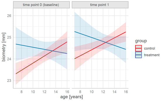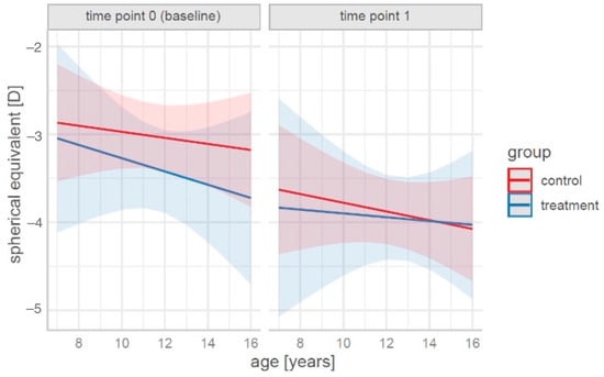 According to the estimated marginal means at the reference age of 12 years (Table 5), axial elongation increased over time in both groups, with a more pronounced change observed in the control group.