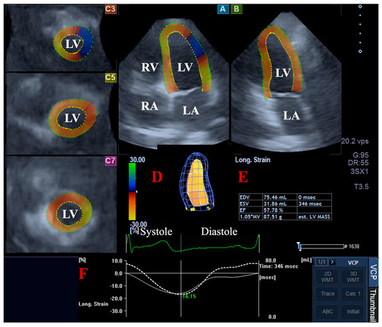 Volumetric assessment of the left ventricle (LV) by three-dimensional (3D) speckle-tracking echocardiography: apical four-chamber (A) and two-chamber long-axis views (B) and short-axis views at basal (C3), midventricular (C5), and apical LV levels (C7) are shown together with a virtual 3D model of the LV (D) and calculated LV volumes (E). Time—global LV circumferential strain curve (white line) and time—LV volume changes curve (dashed white line) are demonstrated as well (F). Abbreviations: LA, left atrium; LV, left ventricle; RA, right atrium; RV, right ventricle; EDV, end-diastolic volume; ESV, end-systolic volume; EF, ejection fraction.