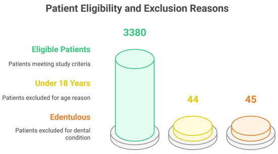 Of the 3469 patients initially assessed, 3380 (97.4%) met the eligibility criteria and were included in this study. A total of 89 individuals were excluded: 44 (1.3%) were under 18 years of age, and 45 (1.3%) were edentulous (Figure 1).