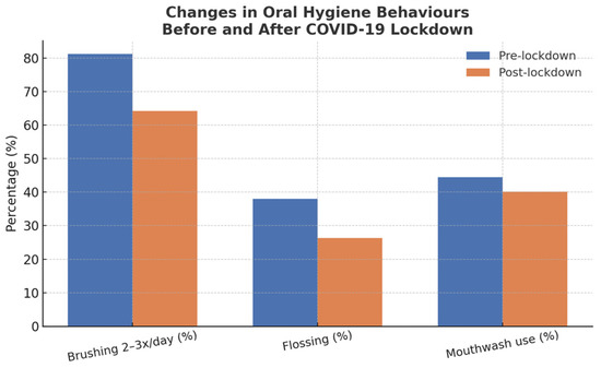 The changes observed in oral hygiene and dietary behaviors may be partially explained by the unique conditions imposed during the COVID-19 lockdown. Restricted mobility, closure of non-essential shops, and fear of contagion in public spaces may have limited access to dental hygiene products such as dental floss or mouthwash [37,38]. Additionally, the interruption of routine dental appointments removed an important motivational and educational opportunity for reinforcing good oral care practices [39,40].