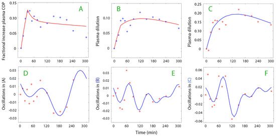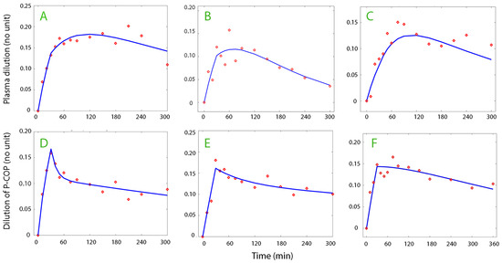 Examples of curve fits. Top row (A–C): Absorption kinetics (blue lines) fitted to plasma dilution (red circles). Bottom row: Two-volume (subplots D and E) and absorption kinetics (subplot F) fitted to the fractional increase in plasma colloid osmotic pressure (COP).