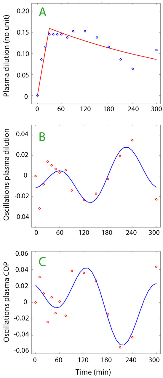 (A) Plasma dilution curve analyzed according to a one-volume kinetic model. Each point represents one measurement of plasma dilution and the red line the optimal curve fit. (B) Oscillations in the plasma dilution curve (Fourier analysis, blue line). (C) Oscillations in the curve for colloid osmotic pressure. Positive oscillations represent vascular contraction, but, for COP, they can also imply the number of molecules with colloid strength that have been added to the plasma. In subplots B and C, each red circle represents the residual of one measurement of plasma dilution after fitting the plasma dilution curve to the best of the three kinetic models, in this case being the one-compartment model.