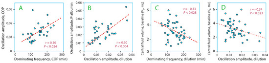 The wave frequency correlated positively with the amplitude for plasma dilution (r = 0.31; p < 0.0257) and plasma COP (Figure 4A). Moreover, the amplitudes for plasma dilution and COP correlated with each other (Figure 4B).