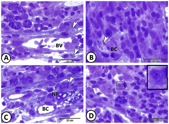 - Chiarini-Garcia, H.; Ferreira, R. Histochemical evidence of heparin in granular cells of Hoplias malabaricus Bloch. Fish Biol. 1992, 41, 155–157. [Google Scholar] [CrossRef]
