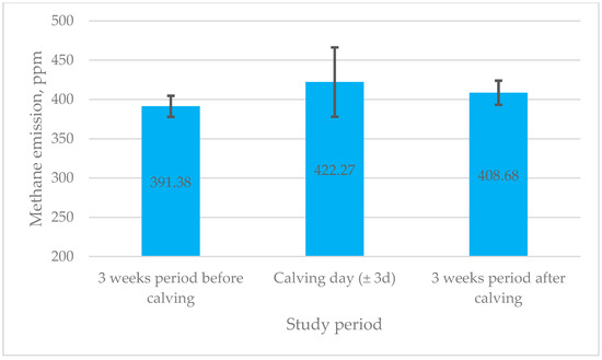 42] demonstrated a significant reduction in the rumination time on the day of calving, reaching its lowest point (262–278 min/d), highlighting the physiological and behavioural stress cows experience during parturition. This stress may compromise rumen function and feeding behaviour. The observed decrease in rumination on the day of calving is likely due to pain and stress, which disrupt normal feeding and chewing patterns, reduce saliva production, and alter rumen fermentation, potentially influencing methane emissions.