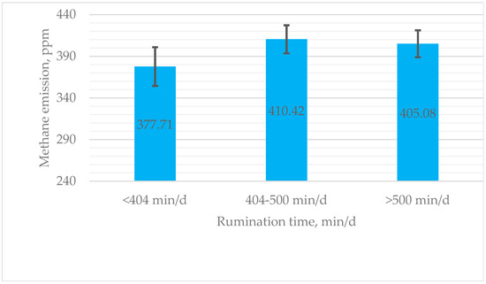 Methane emissions varied among rumination time categories, with cows in the medium rumination group (404–500 min/day) showing the highest methane emissions. Cows exhibiting the longest rumination times (>500 min/day) produced marginally lower methane emissions, whereas the lowest methane emissions were observed in the low-rumination group (<404 min/day). The results contradict the findings of Mikula et al. [
