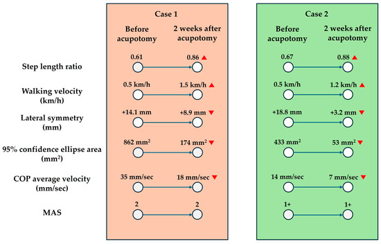 Changes in gait, balance, and spasticity variables before and after ultrasound-guided acupotomy in two stroke patients. While improvements in gait symmetry and balance during standing were observed, no significant differences in the Modified Ashworth Scale (MAS) scores were noted for either case. To facilitate interpretation, the larger value was consistently used as the denominator when calculating the step length ratio. For lateral symmetry, values are expressed as positive (+) when the center of pressure (COP) shifted toward the unaffected side and as negative (–) when shifted toward the affected side, using the midline as the reference. Red arrows (▲ and ▼) indicate increases and decreases in values, respectively. These arrows do not imply clinical improvement or deterioration, as interpretation depends on the specific variable.