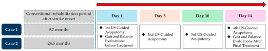Timeline of post-stroke duration and treatment sessions for the two cases. Cases 1 and 2 had elapsed durations of 9.7 and 24.5 months, respectively, since stroke onset, both exceeding the conventional rehabilitation period. Each patient received four sessions of ultrasound-guided acupotomy on Days 1, 5, 10, and 14. Quantitative gait and balance evaluations were conducted twice: immediately before the first treatment (Day 1) and after the final treatment (Day 14). The red arrow indicates the chronological progression of time across the treatment period. US, ultrasound.