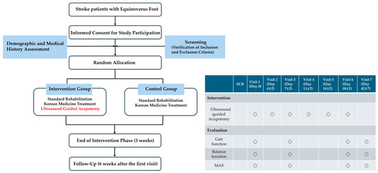 - Calculation basis:This study will be an exploratory clinical trial aiming to evaluate the effects of ultrasound-guided acupotomy on improving gait function in patients with post-stroke equinovarus foot. Exploratory studies of this nature often recommend a minimum number of participants for feasibility. To calculate the target number of participants, the primary efficacy endpoint was set to a significance level (α) of 5% and a power (1 − β) of 80%. The efficacy variable selected was the step length ratio, as referenced in a previous study [9]. Due to the scarcity of studies using ultrasound-guided acupotomy for post-stroke equinovarus foot, we referred to studies that measured the step length ratio as an efficacy indicator. A study by Patterson et al. [9] compared healthy individuals and patients with stroke, demonstrating a significant difference in the step length ratio before and after treatment.The step length ratio approaches 1 as gait symmetry improves, and it decreases as asymmetry increases. In Patterson et al.’s study [9], the step length ratio was 0.87 in the stroke group and 0.97 in the healthy group, with a statistically significant difference at a significance level of 0.01. Based on these data, we assumed a clinically meaningful change in the step length ratio (ε) of 0.10 and a common standard deviation (δ) of 0.11. Using these variables, the calculated sample size per group was 19. Based on an expected dropout rate of 20%, the sample size per group was adjusted to 24, resulting in a total of 48 participants for the study.
