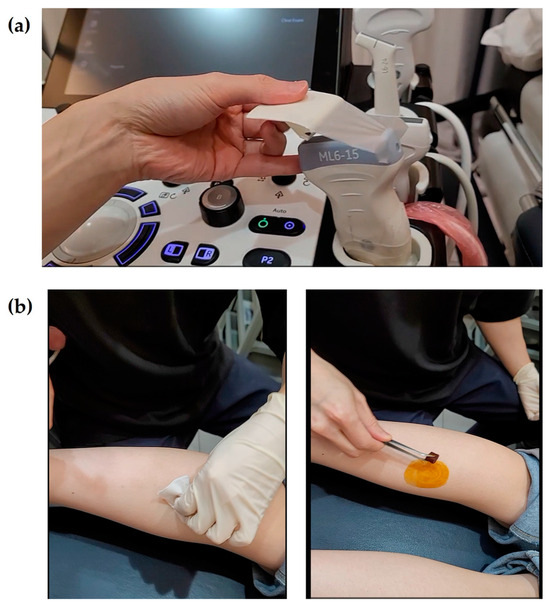 - Before the procedure, a sterile drape (disposable surgical contact drape, 3M Steri Drape 1050) will be applied to the ultrasound probe (Figure 5a). The probe and the treatment site will then be disinfected twice using an alcohol swab and povidone–iodine solution (Figure 5b).