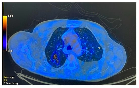 The patient was referred to the pulmonology department following combined imaging exploration (computed tomography—CT; positron emission tomography—PET) which revealed multiple pulmonary micro- and macronodular lesions with diffuse contours, located in the segments of both upper lobes and the right Fowler segment, with varying degrees of metabolic activity (Figure 1). Additionally, a flat, moderately enhancing lesion was located on the left lateral pleura, along with left pleurisy. There were also flat, metabolically active lesions at the level of the inner surface of the diaphragmatic domes and large-volume ascites.