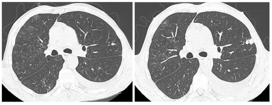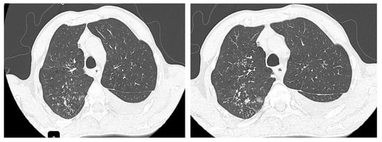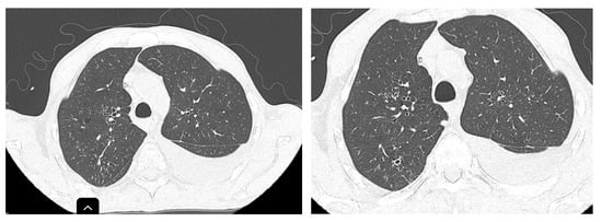 The CT scan performed at the initiation of treatment revealed micronodular “tree-in-bud” infiltration predominantly in the upper half (Figure 2), bilaterally, with left-sided pleural effusion and large-volume fluid in the abdominopelvic cavity.